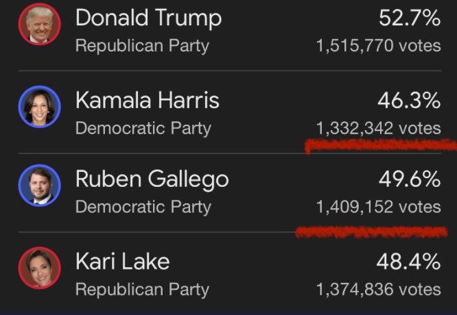 アリゾナ州で何が起きているのか?上院選はルーベン・ガレゴの勝利が決まったが、彼は州内でカマラ・ハリスより多くの票を得たらしい。カリ・レイクもカマラより多くの票を得たが、ガレゴよりは少ない。