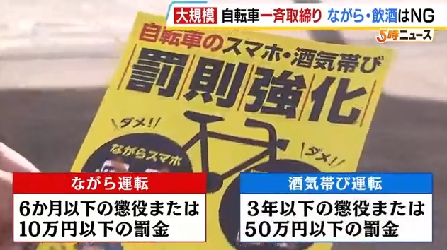 自転車の運転をめぐっては11月、改正道路交通法が施行。スマートフォンで通話したり、画面を見たりしながらの「ながら運転」の罰則が強化され、新たに「酒気帯び運転」も処罰の対象となりました。