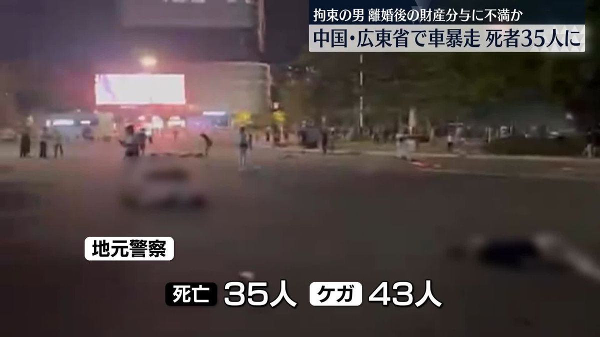 広東省・珠海市では11日、体育施設の周辺で車が暴走し、これまでに35人が死亡、43人がけがをしました。