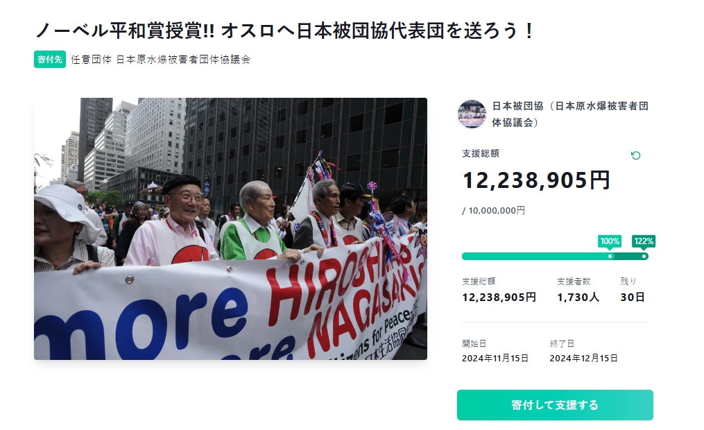 【授賞式】ノーベル賞委員会「代表3名の旅費がでます」被爆者「31人+家族でいきます、クラファンするので出して!」→開始1日で1千万円達成※賞金1億5600万円には触れず