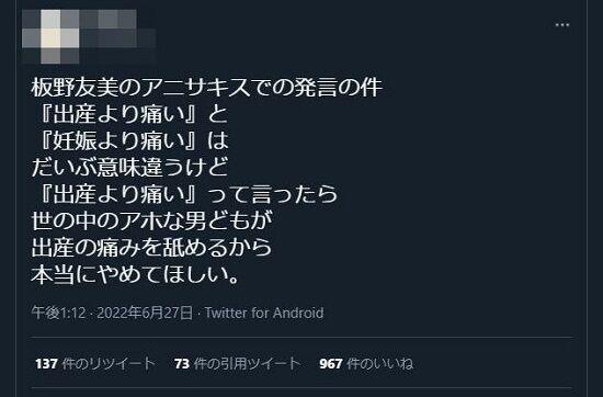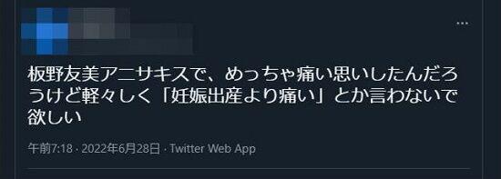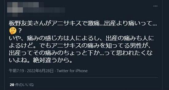 板野友美「アニサキスは出産より痛かった」←フェミさん顔を真っ赤にしてブチギレwww