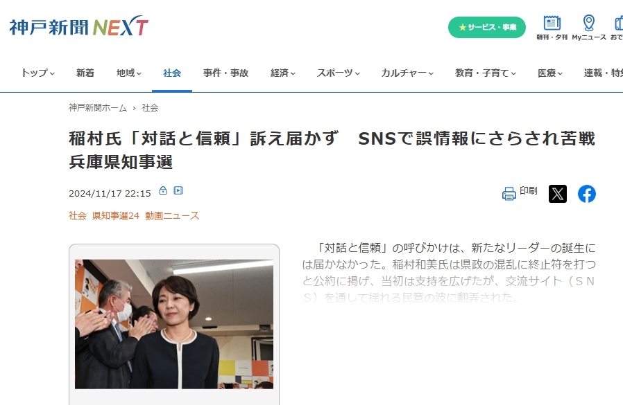 【悲報】神戸新聞「えー、稲村和美候補は、SNSの誤情報によって落選しました」