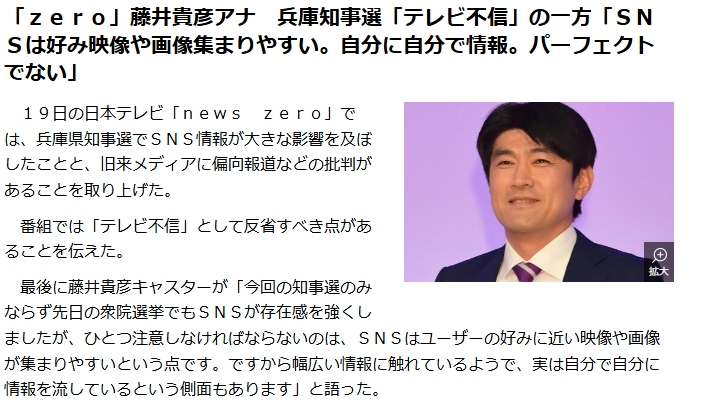 19日の日本テレビ「news zero」では、兵庫県知事選でSNS情報が大きな影響を及ぼしたことと、旧来メディアに偏向報道などの批判があることを取り上げた。
