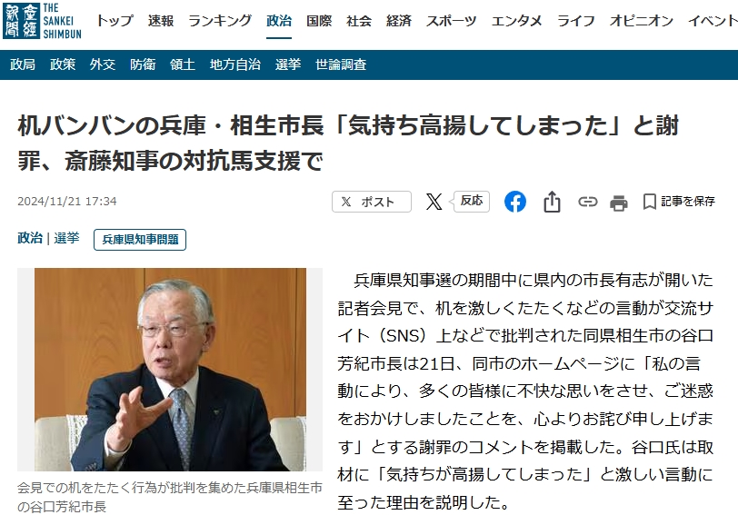 兵庫県知事選の期間中に県内の市長有志が開いた記者会見で、机を激しくたたくなどの言動が交流サイト(SNS)上などで批判された同県相生市の谷口芳紀市長は21日、同市のホームページに「私の言動により、多くの皆様に不快な思いをさせ、ご迷惑をおかけしましたことを、心よりお詫び申し上げます」とする謝罪のコメントを掲載した。谷口氏は取材に「気持ちが高揚してしまった」と激しい言動に至った理由を説明した。