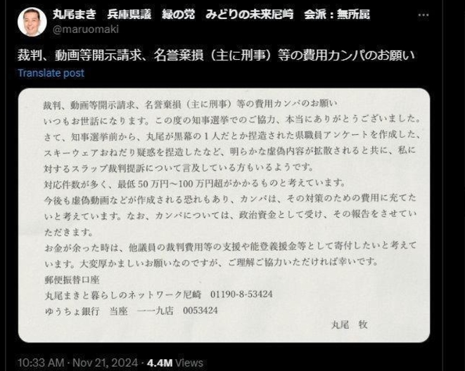 1: 名無し 2024/11/22(金) 13:20:59.34 ID:FvtqnA9G0● BE:662593167-2BP(2000)兵庫県議で、斎藤元彦知事の疑惑告発文書問題を審議する県議会の文書問題調査特別委員会(百条委員会)メンバーの丸尾牧氏が21日付でSNS投稿。斎藤知事の一連の問題や、兵庫県知事選などを巡って、「黒幕の1人」「疑惑を捏造」などの「虚偽内容」が拡散されていると記し、裁判費用などのカンパを求めた。「裁判、動画等開示請求、名誉棄損(主に刑事)等の費用カンパのお願い」と題した書面の画像を投稿した。