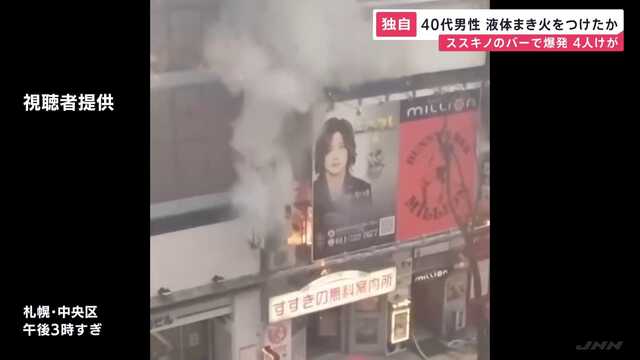 26日午後、札幌市の歓楽街すすきのでビルが爆発し、男女4人が全身やけどを負った火災で、運ばれた40代の男性がガソリンのような液体を店にまき、火をつけていたことが関係者への取材でわかりました。