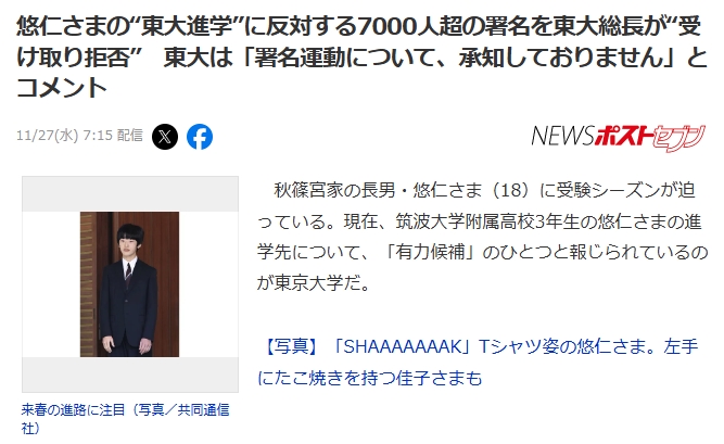 団体「悠仁さまの東大進学に反対する7000人超の署名集めたぞハァハァこれが民意だ!」→東大総長「あ、受取拒否しまーす」ゴミと化す