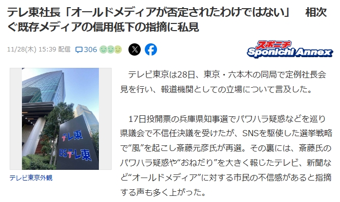 【速報】テレ東社長「オールドメディアが否定されたわけではない」でもSNSは規制しろ