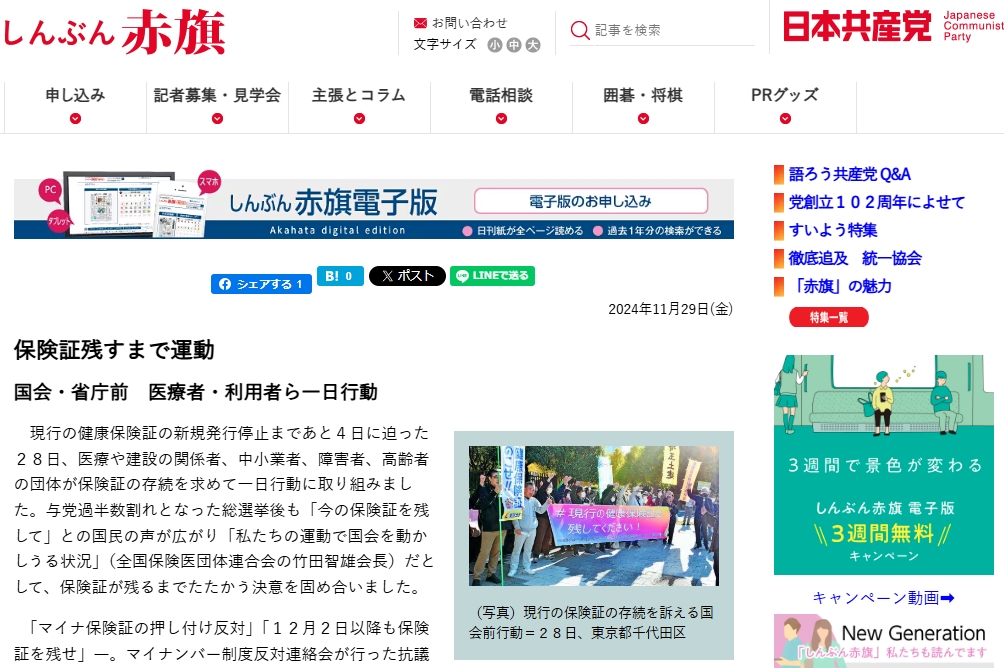 現行の健康保険証の新規発行停止まであと4日に迫った28日、医療や建設の関係者、中小業者、障害者、高齢者の団体が保険証の存続を求めて一日行動に取り組みました。与党過半数割れとなった総選挙後も「今の保険証を残して」との国民の声が広がり「私たちの運動で国会を動かしうる状況」(全国保険医団体連合会の竹田智雄会長)だとして、保険証が残るまでたたかう決意を固め合いました。