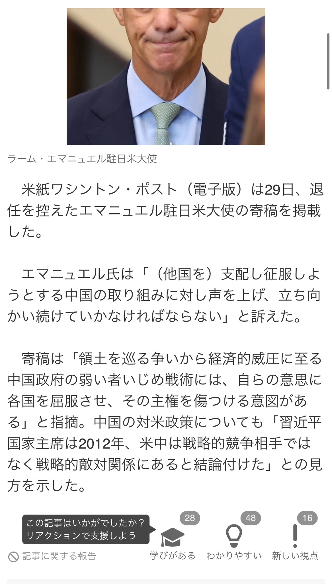 【悲報】エマニュエル駐日米国大使、退任前最後のメッセージ「中国と対決せよ」