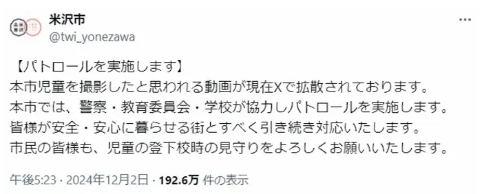山形・米沢市の公式X(旧ツイッター)が3日までに更新され、ネット上で物議を醸している同市の様子を投稿した動画について、声明を発表した。