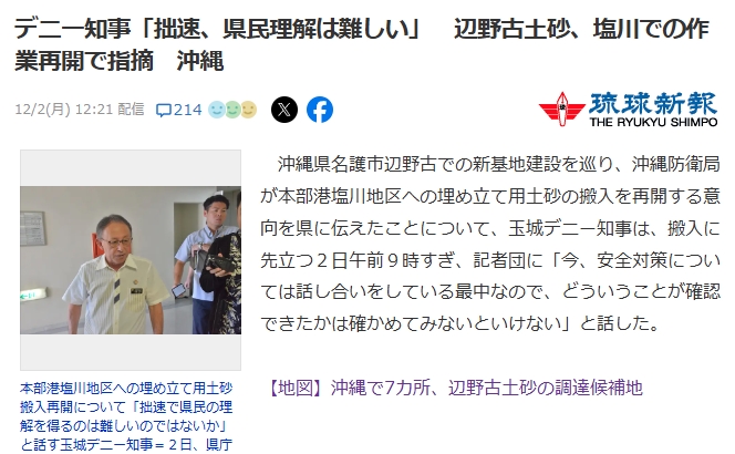 デニー知事、沖縄防衛局の搬入再開に苦言「今、安全対策については話し合いをしている最中なのに?」