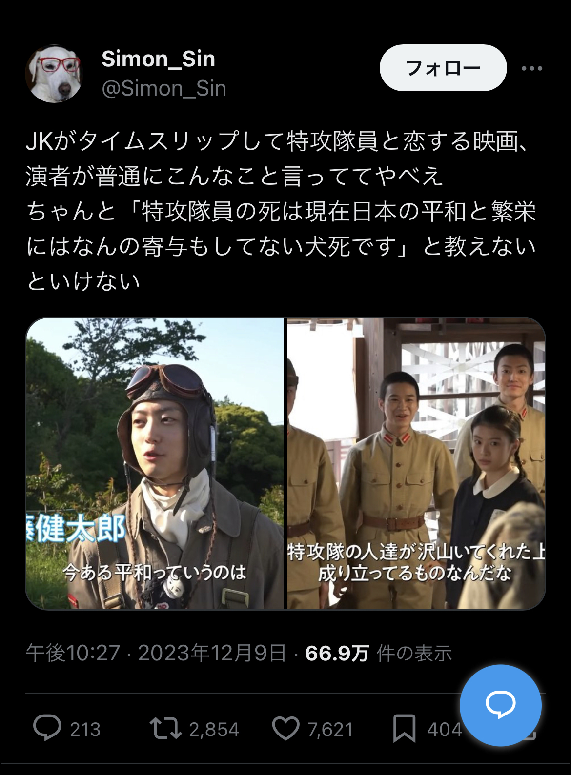 【速報】俳優復帰の伊藤健太郎「今ある日本の平和は特攻隊のおかげで成り立ってる」→SNSで晒し上げられる