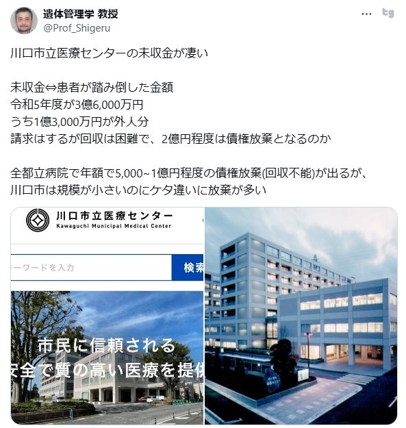 【話題】川口市立医療センターの未収金が凄い 令和5年度が3億6,000万円のうち1億3,000万円が外国人「川口市、全都立病院レベルの債権放棄を余裕で超える」