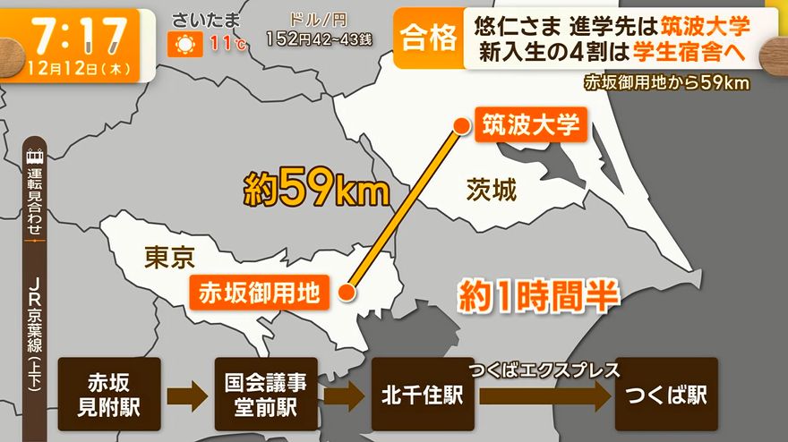 筑波大は車や電車で都内から1時間半程度。来年4月から進学されるが、関係者は「宮内庁が検討中だが赤坂御用地から通われる可能性が高い」としている。