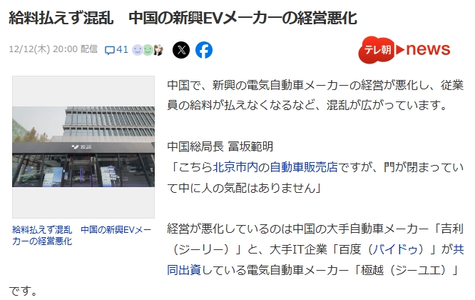 「こちら北京市内の自動車販売店ですが、門が閉まっていて中に人の気配はありません」経営が悪化しているのは中国の大手自動車メーカー「吉利(ジーリー)」と、大手IT企業「百度(バイドゥ)」が共同出資している電気自動車メーカー「極越(ジーユエ)」です。