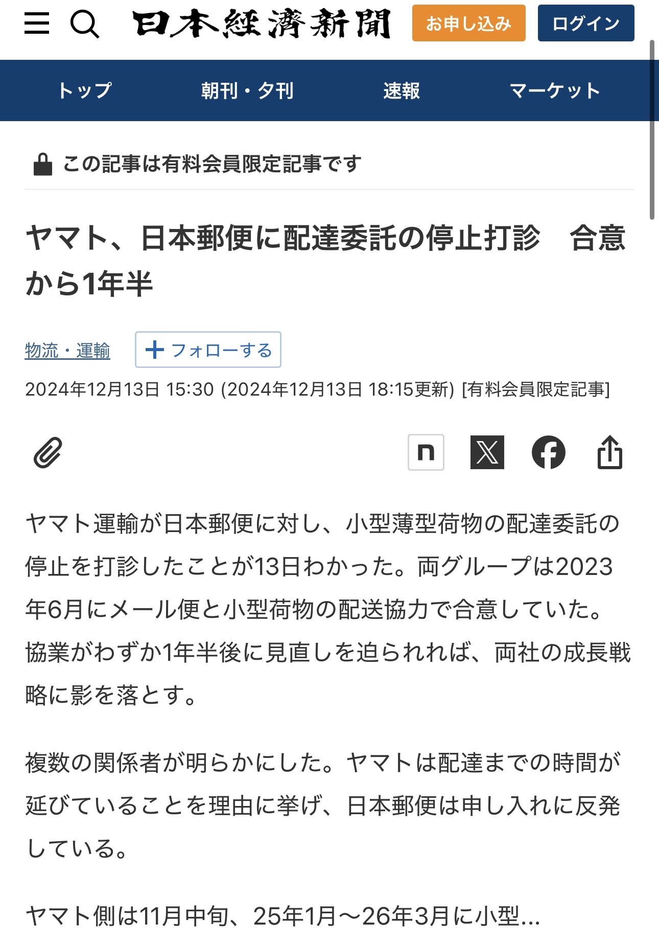 ヤマト運輸「日本郵便と提携すると言ったな。遅すぎて使えねーから辞めるわ」→郵便局ブチギレwwwww