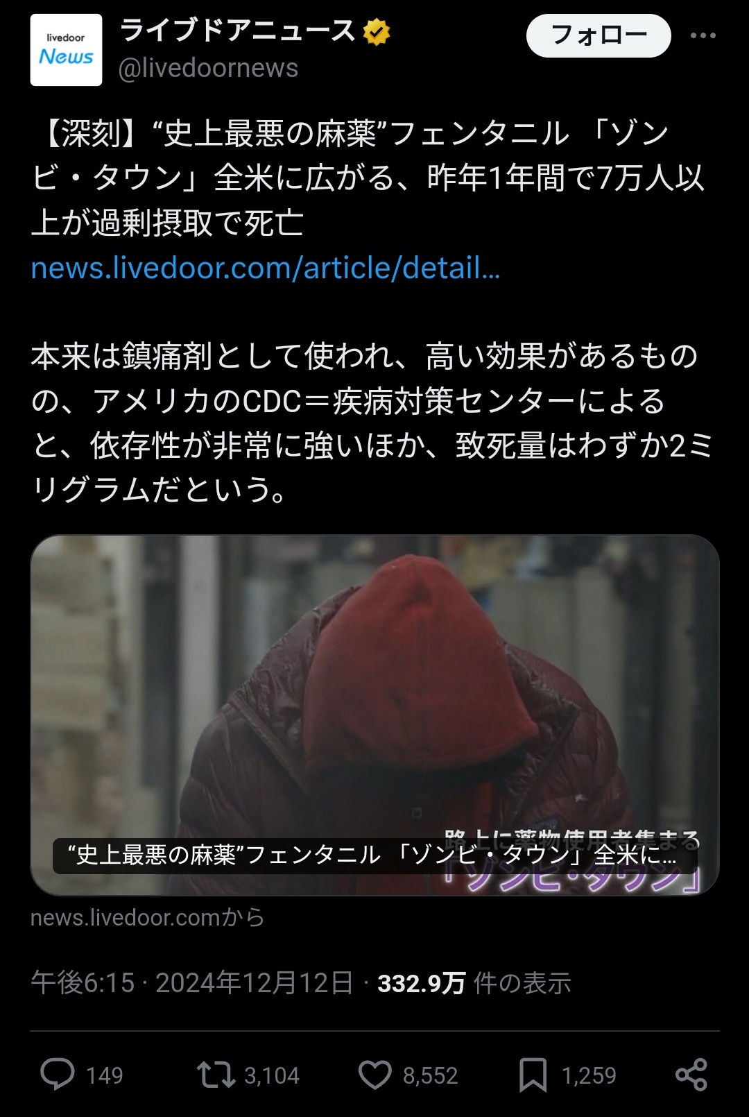 【阻止できず】中国から輸出した地上最悪の薬物フェンタニル(※致死量2mg※アヘンの1万倍)でアメリカ中がゾンビタウンと化している模様