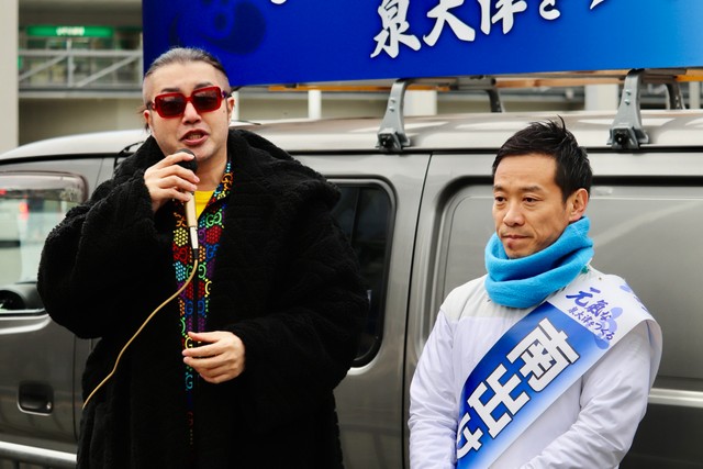 政治団体・ごぼうの党の奥野卓志代表(50)が14日、大阪府泉大津市の南海泉大津駅前で、泉大津市長選(15日投開票)で3選を目指す無所属現職の南出賢一氏(44)を支持する政治団体・元気な泉大津をつくる会の街頭演説に登場。NHKから国民を守る党党首の立花孝志氏(57)の立候補で注目が高まる同市長選に〝参戦〟した。