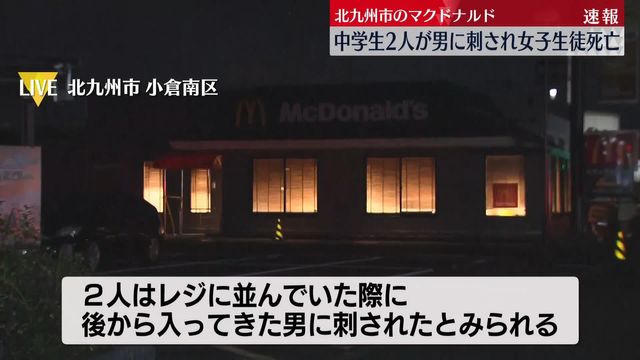 北九州市小倉南区のファストフード店で中学生の男女2人が男に刃物で刺されこのうち、女子生徒が死亡しました。男は現場から逃走したということで警察が行方を捜査しています。