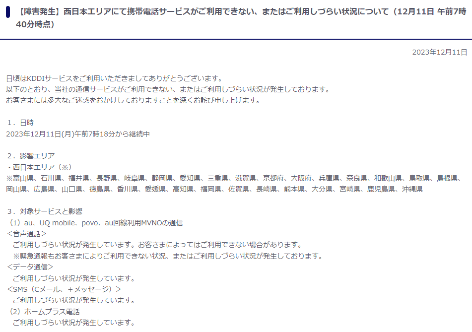 【障害発生】西日本エリアにて携帯電話サービスがご利用できない、またはご利用しづらい状況について(12月11日 午前7時40分時点)
