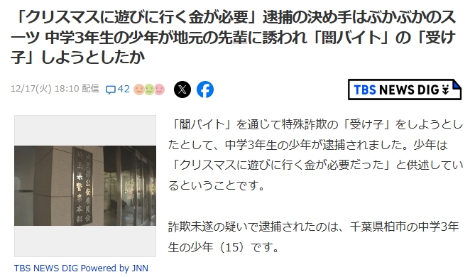 【速報】中学生が闇バイト「クリスマスに遊ぶお金が欲しかった」