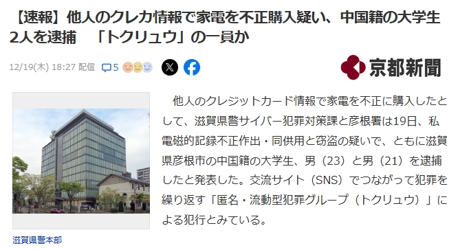 他人のクレジットカード情報で家電を不正に購入したとして、滋賀県警サイバー犯罪対策課と彦根署は19日、私電磁的記録不正作出・同供用と窃盗の疑いで、ともに滋賀県彦根市の中国籍の大学生、男(23)と男(21)を逮捕したと発表した。交流サイト(SNS)でつながって犯罪を繰り返す「匿名・流動型犯罪グループ(トクリュウ)」による犯行とみている。