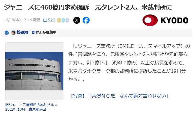 旧ジャニーズ事務所(SMILE―UP.、スマイルアップ)の性加害問題を巡り、元所属タレント2人が同社や元幹部らに対し、計3億ドル(約460億円)以上の賠償を求めて、米ネバダ州クラーク郡の裁判所に提訴したことが19日分かった。同社がジャニー喜多川氏(2019年死去)による性加害を認めた昨年9月以降、被害者側が賠償を求めて提訴したのは初めてとみられる。