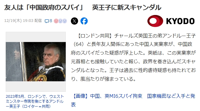 1: 名無し 2024/12/19(木) 20:27:53.41 ID:hyQSr3Ox0● BE:662593167-2BP(2000)チャールズ英国王の弟アンドルー王子(64)と長年友人関係にあった中国人実業家が、中国政府のスパイだった疑惑が浮上した。英紙は、この実業家が元首相とも接触していたと報じ、政界を巻き込んだスキャンダルとなった。王子は過去に性的虐待疑惑も持たれており、風当たりが強まっている。英メディアによると、実業家は中国雲南省生まれのヤン・テンボ氏。2002年に留学のため渡英し、その後英国でコンサル会社を設立した。当局は「H6」と称していたが、16日に実名を明らかにした。
