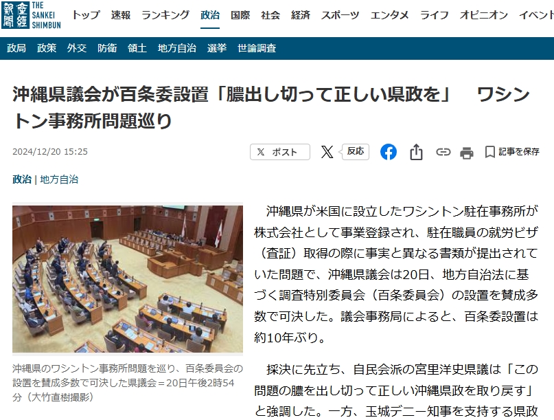 沖縄県が米国に設立したワシントン駐在事務所が株式会社として事業登録され、駐在職員の就労ビザ(査証)取得の際に事実と異なる書類が提出されていた問題で、沖縄県議会は20日、地方自治法に基づく調査特別委員会(百条委員会)の設置を賛成多数で可決した。議会事務局によると、百条委設置は約10年ぶり。