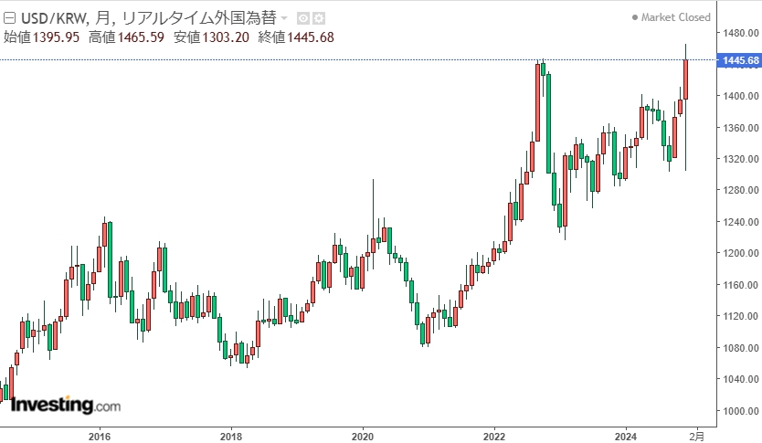 1: 名無し 2024/12/21(土) 09:40:39.16 ID:IdYCdf600● BE:662593167-2BP(2000)韓国政府がウォン安ドル高を防ぐための総力戦に入った。市中銀行の外貨流動性確保を支援し、外貨貸出規制は緩和することにした。最近、外貨準備高と外国為替平衡基金のほか国民年金を活用するなど使用可能手段を総動員する姿だ。20日にも1ドル=1451.4ウォン(週間終値基準)となり、金融危機だった2009年と似た「危険水位」であるからだ。企画財政部はこの日、金範錫(キム・ボムソク)第1次官の主宰で金融委員会・韓国銀行(韓銀)・金融監督院と緊急マクロ経済・金融懸案懇談会を開き、「外国為替需給改善法案」を発表した。対策の核心は外国為替流入規制の緩和だ。政府は市中銀行の「先物為替ポジション」限度を国内銀行は前月末の自己資本比50%から75%に、外国系銀行の国内支店は250%から375%にそれぞれ引き上げることにした。先物為替ポジション限度を高めれば為替取引がさらに活発になり、国内に外貨がさらに多く流入する可能性がある。