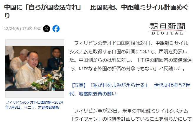 1: 名無し 2024/12/24(火) 19:07:33.79 ID:O+xz454+0● BE:662593167-2BP(2000)フィリピンのテオドロ国防相は24日、中距離ミサイルシステムを取得する自国の計画について、声明を発表した。中国側からの批判に対し、「主権の範囲内の装備調達で、いかなる外国の拒否の対象でもない」と反論した。