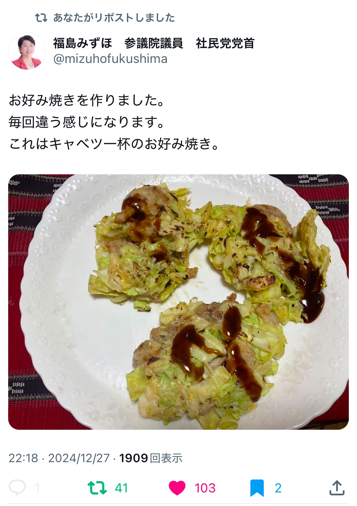 【画像】福島みずほ「お好み焼きを作りました。これはキャベツ一杯のお好み焼き」嫌味かと話題、現在キャベツ3倍以上の高騰が報道「庶民は食べられない」