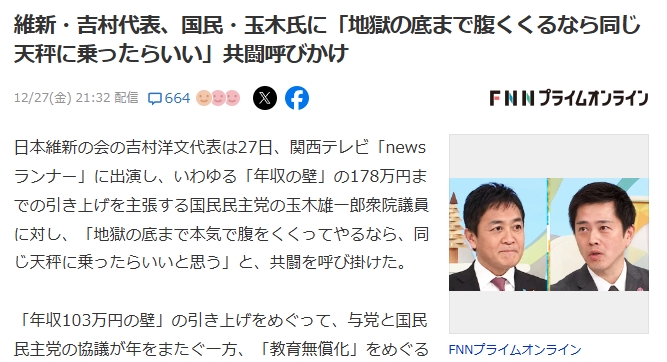 日本維新の会の吉村洋文代表は27日、関西テレビ「newsランナー」に出演し、いわゆる「年収の壁」の178万円までの引き上げを主張する国民民主党の玉木雄一郎衆院議員に対し、「地獄の底まで本気で腹をくくってやるなら、同じ天秤に乗ったらいいと思う」と、共闘を呼び掛けた。