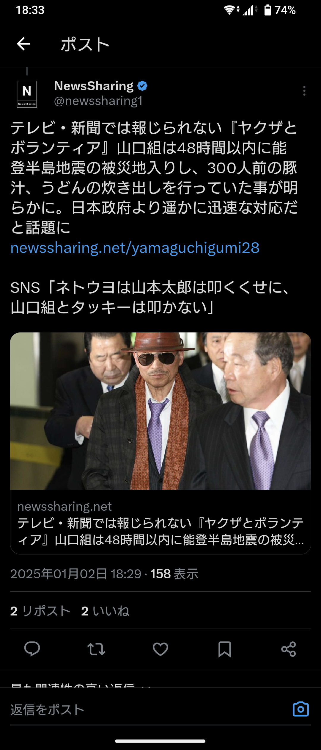 山口組さん、能登半島地震48時間以内に既に300人前の豚汁、うどんの炊き出し、山本太郎か?