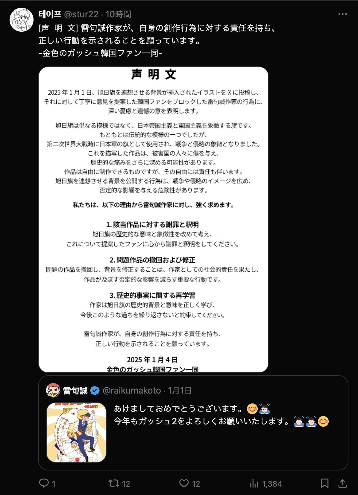 【悲報】金色のガッシュの作者、Xで韓国ファン一同に絡まれる「新年のイラストが旭日旗に見えるニダ!」作者が声明で正論パンチwww