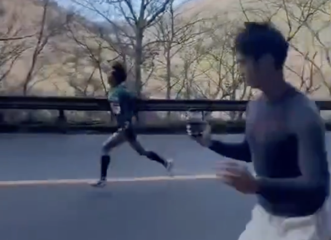 動画では、若林と併走しながら動画撮影をする男性に向け、大会スタッフがマイクで「大変危険ですので、沿道を走らないようにお願いします」と呼びかけたことが確認できる。ところが、男性はスタッフの注意を無視して併走し続けた。