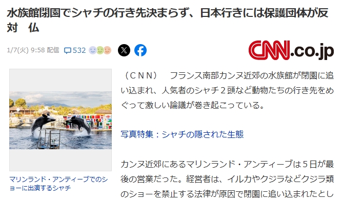 (CNN) フランス南部カンヌ近郊の水族館が閉園に追い込まれ、人気者のシャチ2頭など動物たちの行き先をめぐって激しい論議が巻き起こっている。