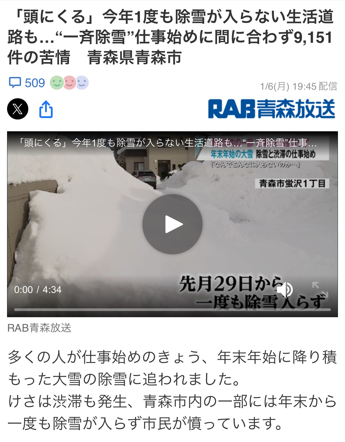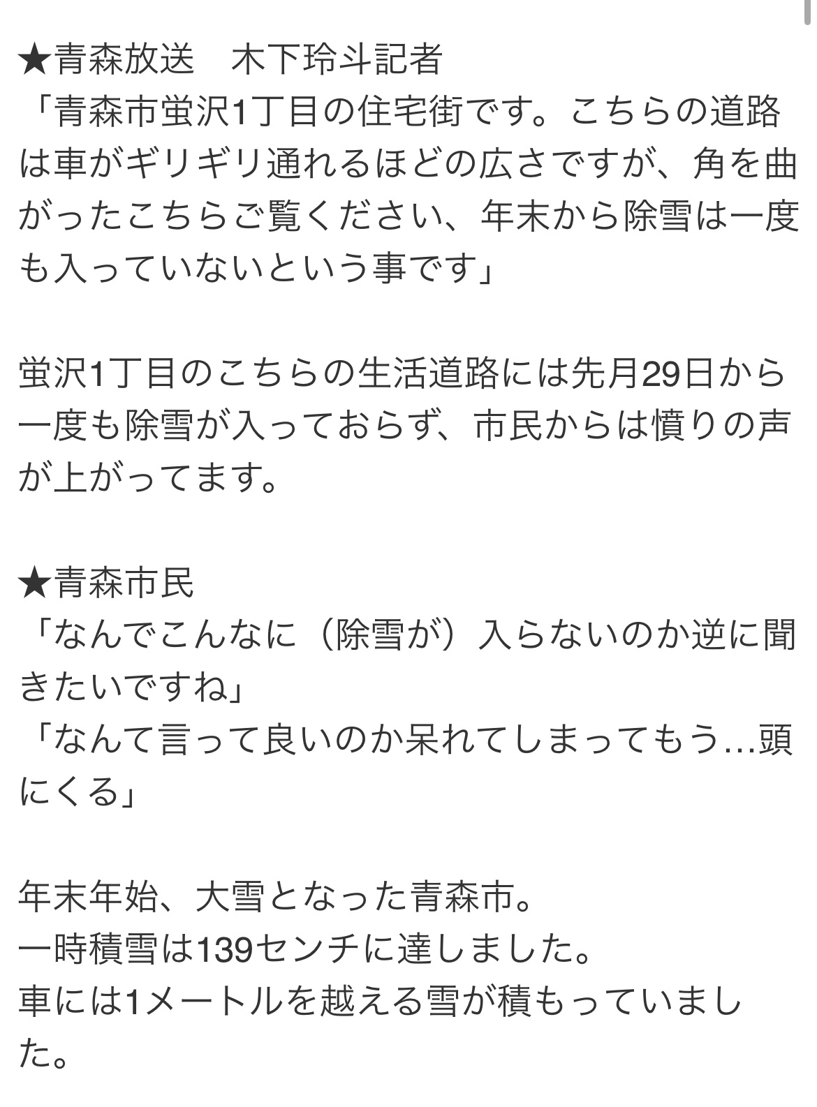【画像】青森県民、遂にキレた!「一度も除雪に入ってない生活道路が多すぎる!公務員は何をしてるのか」