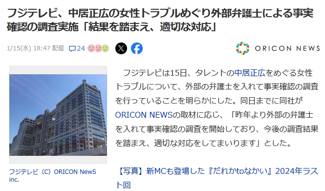 【速報】芸能界の闇・フジテレビが遂に終焉 外部弁護士による事実確認の調査実施「当該社員は一切関与なし」は変わらず 開示祭りか