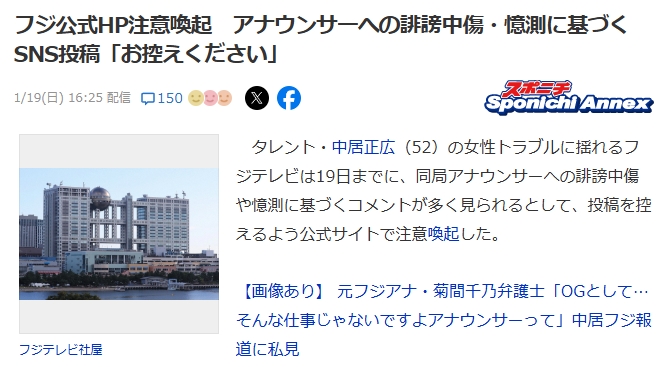 タレント・中居正広(52)の女性トラブルに揺れるフジテレビは19日までに、同局アナウンサーへの誹謗中傷や憶測に基づくコメントが多く見られるとして、投稿を控えるよう公式サイトで注意喚起した。