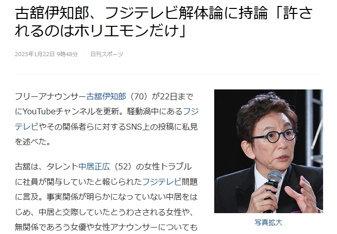 フリーアナウンサー古舘伊知郎がYouTubeチャンネルにて中居正広の女性トラブルとフジテレビの問題に言及。