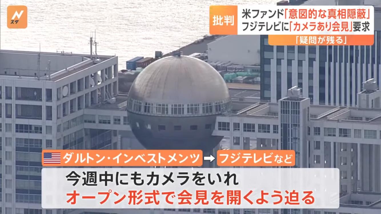 【悲報】フジテレビさん、アメリカ投資会社から今週中にカメラありの会見を開くように迫られる