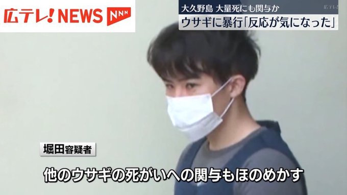 警察によると堀田容疑者は21日、広島県竹原市の大久野島の遊歩道でウサギ1匹を蹴った疑いです。ウサギは死にました。