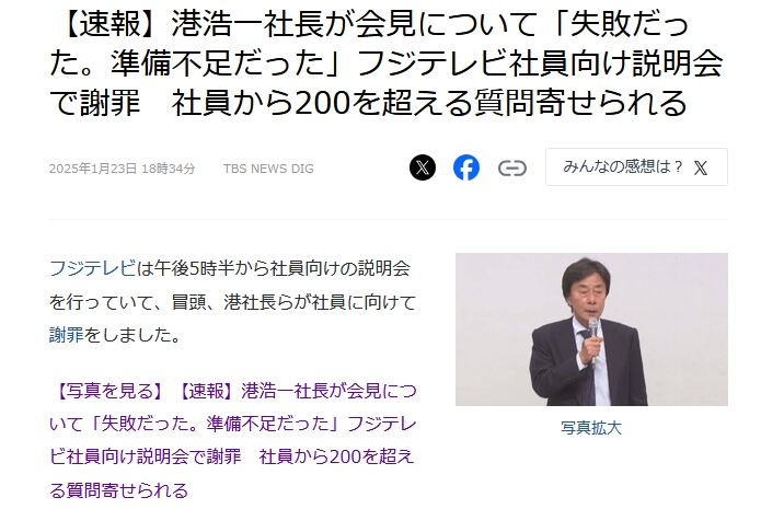 【速報】フジテレビ社長、社員に謝罪 社員から200を超える質問も「記者会見に失敗してすまん」秒で流出wwww