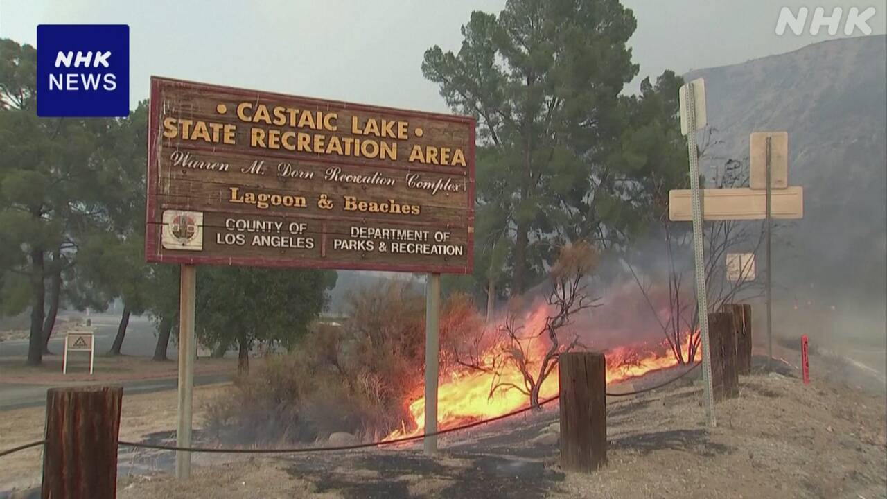 ロサンゼルス近郊で今月7日に発生した山火事の消火活動が続けられる中、22日には新たに発生した山火事が急速に燃え広がり、近隣の住民5万人以上に避難の指示や警告が出される事態となっています。こうした中、22日、ロサンゼルスの北の近郊にあるキャスティークで新たに山火事が発生し、消防によりますと火災の範囲は6時間で東京ドーム800個分以上に相当するおよそ38平方キロメートルに拡大しました。地元メディアによりますとこれに伴い近隣に住む5万人以上に対し避難の指示や警告が出されているということです。