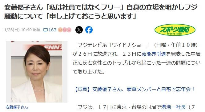 【ワイドナ】安藤優子、まずは冒頭しっかり保身「私はフリー」自身の立場を明かしフジ騒動「現認したり、その場に居合わせたり、話を聞いたり、うわさすら聞いたことはない」