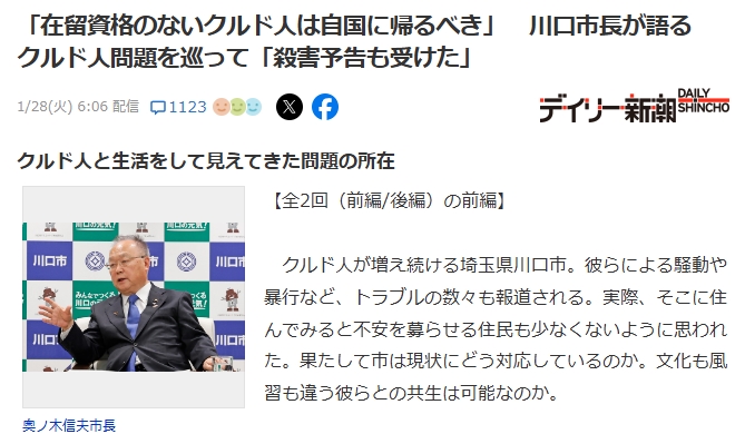 埼玉県・川口市長「在留資格のないクルド人は帰るべき」「私はクルド人をウェルカムしているわけではない。誤った解釈がSNSで拡散され、脅されて大変迷惑」