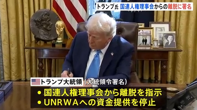 1: 名無し 2025/02/05(水) 12:12:00.77 ID:Y9VmZVjj0● BE:662593167-2BP(2000)アメリカのトランプ大統領は、国連人権理事会から離脱する大統領令に署名しました。第一次政権の時に続き、2回目の離脱です。トランプ大統領は4日、国連人権理事会とUNRWA=国連パレスチナ難民救済事業機関からの離脱を指示する大統領令に署名しました。また、ユネスコ=国連教育科学文化機関からの離脱や、国連に対する拠出金についても検討するよう指示しています。