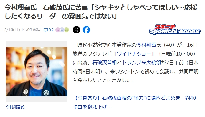 今村翔吾氏 石破茂氏に苦言「シャキッとしゃべってほしい…応援したくなるリーダーの雰囲気ではない」